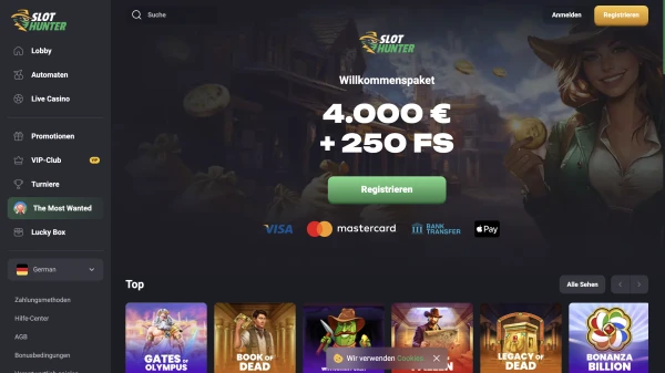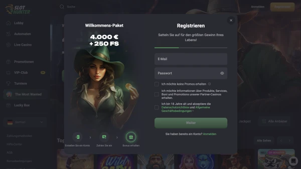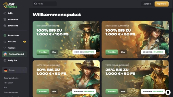 Unser Hauptangebot im Casino ist ein dreiteiliges Willkommenspaket für neue Spieler. Der Bonus auf die erste Einzahlung beträgt 150% bis zu 1000 EUR bei einer Mindesteinzahlung von 20 EUR und einem Umsatz von 40x auf Einzahlung plus Bonus. Die zweite Einzahlung bietet 100% bis zu 2000 EUR, ebenfalls ab 20 EUR, mit 35x Umsatz auf Einzahlung plus Bonus. Die dritte Einzahlung enthält Freispiele, gelistet als bis zu 1000 Freispiele, mit einer Mindesteinzahlung von 20 EUR und 30x Umsatz auf Gewinne.